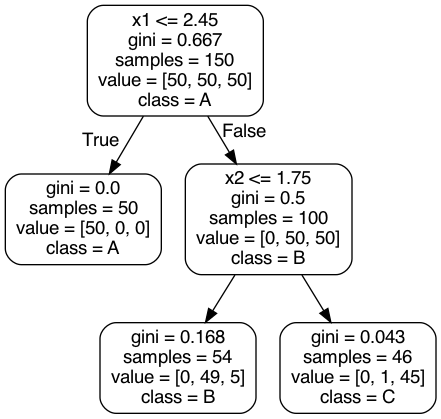 Such a flowchart above tells how future predictions are made. Predicting the class of a new data point (\(x_1^\text{new}\), \(x_2^\text{new}\)), one simply follows the ‘route’ of the tree starting from the root node (on top) and ‘answering’ the conditions. Is \(x_1\) lower than 2.45? Yes, go to the left (and it corresponds to predicted class A). If not, go to the next node evaluating \(x_2\) feature, etc.