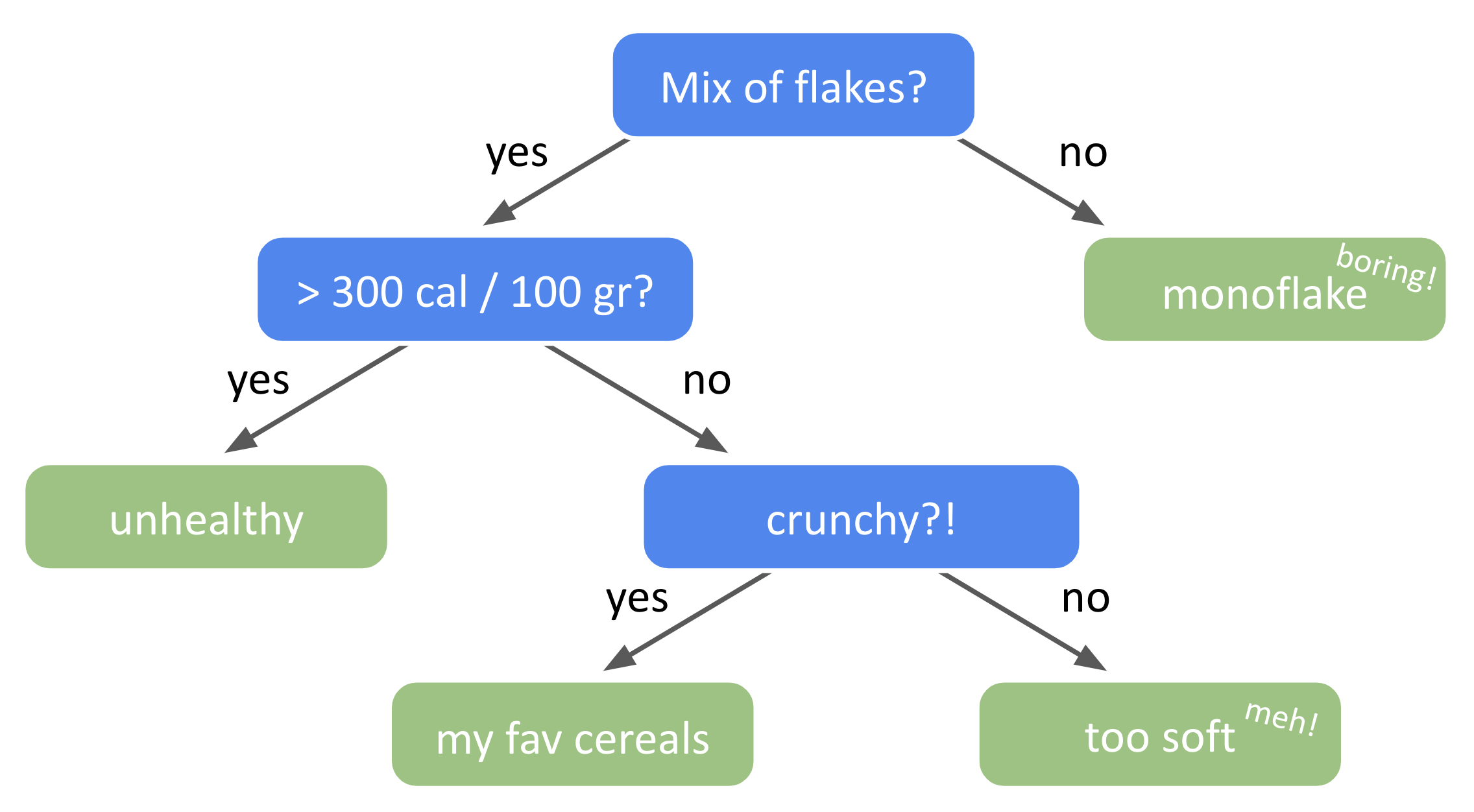 Your decision protocol followed a tree process starting with a node (a decision to make), then evaluating a condition on a feature (number of flake type, calorie density, crunchiness factor) and, depending on the answer, another node evaluates another input feature. Such a decision-making process can be visualized like a tree whose branches are the different outcomes and leaves the final choices: