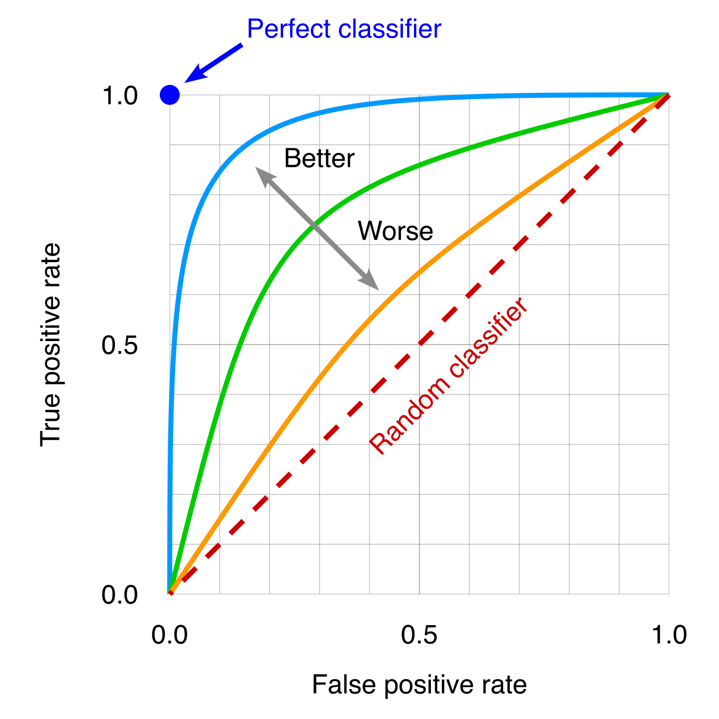 We can see from the picture that the more the curve approaches the ideal classifier, the better it is. We can use the area under the ROC curve to have a single number to then quantitatively compare classifier on the whole.