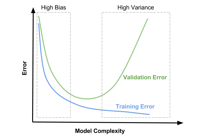 Fig. 30 . Visualization of the error (cost function) with respect to the model’s complexity for the training and validation sets. The ideal complexity is in the middle region where both the training and validation errors are low and close to one another.