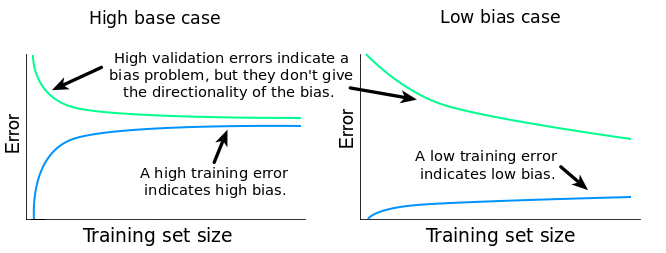 Fig. 31 . Interpretation of the error plots as a function of the number of samples in the dataset for low and high bias/variance situations.