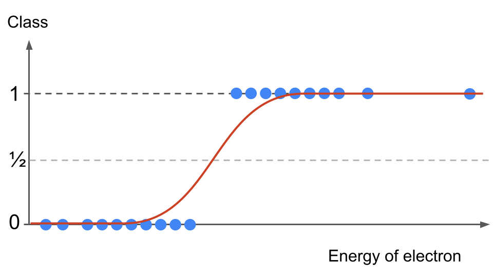 In our example with the energy of the electron, we could see from the data (easily because it is only in one dimension) that the bigger the energy of the electron, the more likely it is for the event to be classified as signal. If we overlay the S-curve on the data points, we start seeing interesting things.