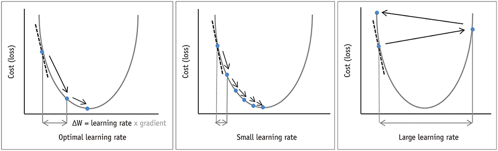 Fig. 16 . The learning rate determines the step at which the parameters will be updated (left). Small enough: the gradient descent will converge (middle). If too large, the overshoot can lead to a diverging gradient, no more “descending” towards the minimum (right).