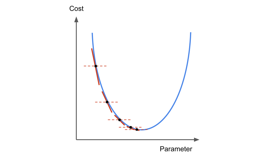 Divergence: if the next paremeter is at a greater distance than the \(\theta^{\min J}\) minimizing the cost function (\( | \theta' - \theta^{\min J} | > | \theta - \theta^{\min J} |\)), the gradient descent will produce new parameters further and further away, escaping the parabola! It will diverge. We want to avoid this.