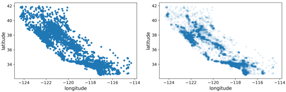Fig. 61 . A scatter plot with full opacity (left) and alpha=0.1 (right). The transparency brings out the areas of high data density.
