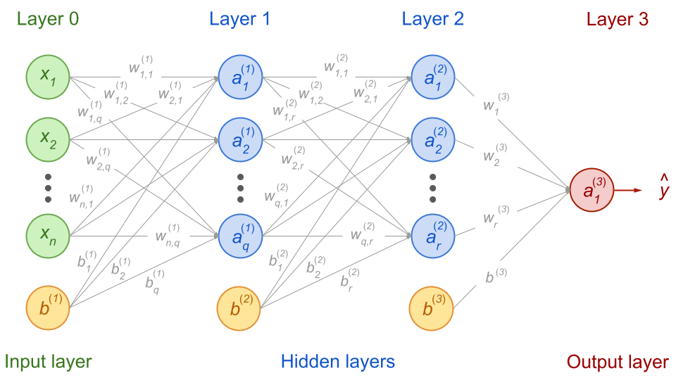 Let’s say we have the following network with \(x_n\) input features, one first hidden layer with \(q\) activation units and a second one with \(r\) activation units. For simplicity, we will choose an output layer with only one node:
